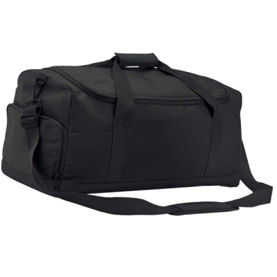 100% recycled 600D polyester. PU coated base panel. Padded hand grip. Detachable adjustable shoulder strap with pad. Main zip compartment with two way zip. Front zip pocket. Shoe tunnel/wet pocket. Internal mesh pocket. Outer mesh pocket. Tear out label. Capacity 32 litres.